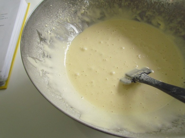 2. Mélangez les 100 g de farine à la préparation jaunes d’œufs et sucre. Ajoutez les 25 g de beurre fondu et mélangez de nouveau.