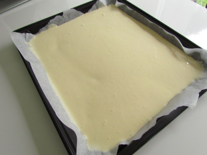 6. Versez cette préparation sur une plaque en silicone ou sur une plaque recouverte de papier sulfurisé (35 sur 25 cm) et égalisez à l’aide d’une spatule.