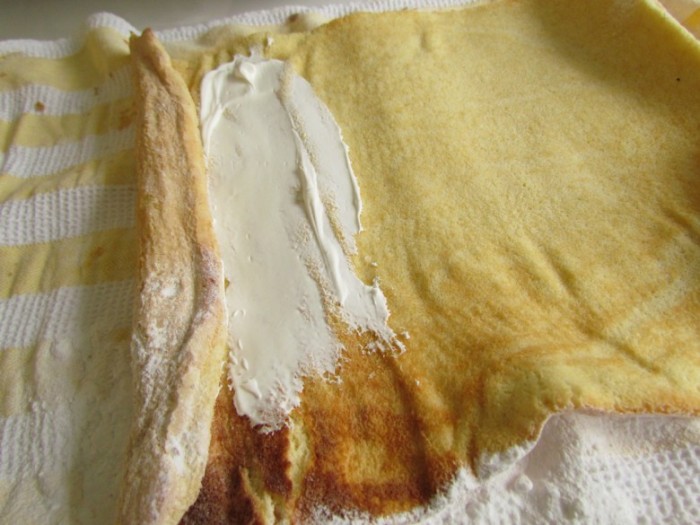 14. Après ce temps de repos, déroulez délicatement le biscuit en le laissant sur le torchon humide. Étalez le mélange mascarpone/fromage frais/sucre à l’aide d’une spatule.